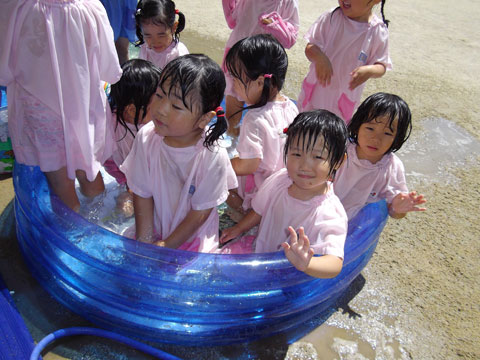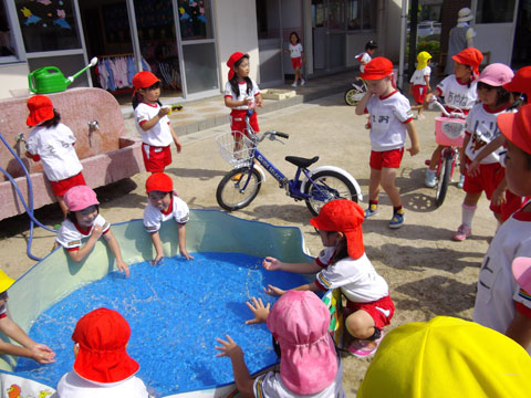 誰が使うのか?ミニプールに貯めた水で涼む園児や、