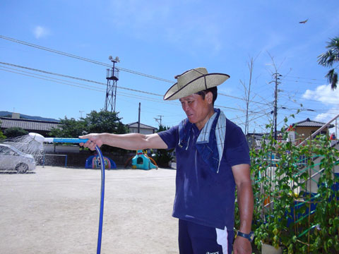 畑名人も今日は、アサガオやヒマワリに水をあげた後は、