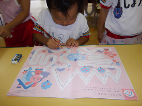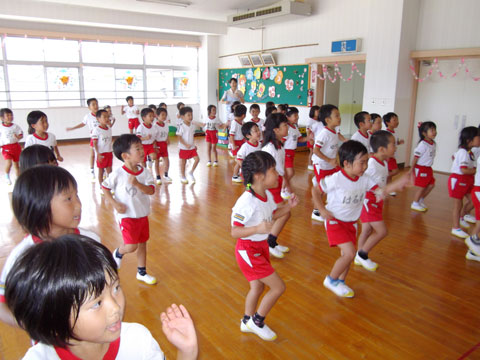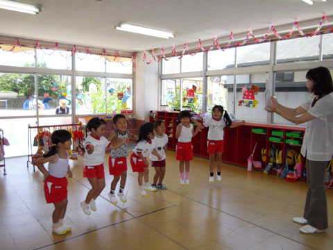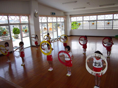 年長組さんはおゆうぎ室にて盆踊りの練習や、リングバトン