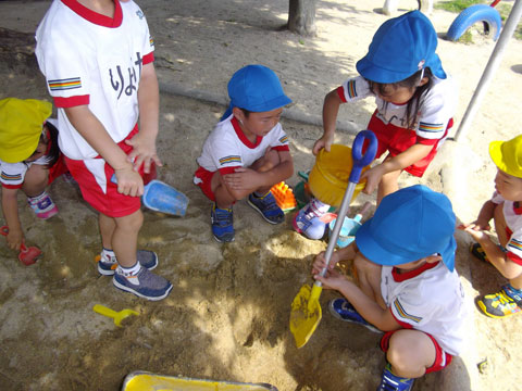 葉っぱで日陰になっている砂場にて建設作業中の園児たち