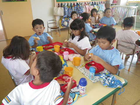 午前中マーチングを頑張った年長組さんも、みーんな給食後には・・