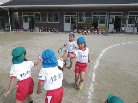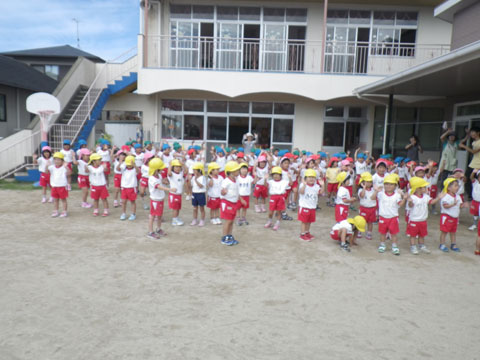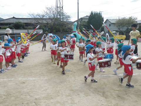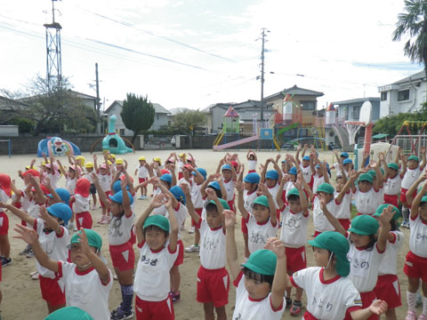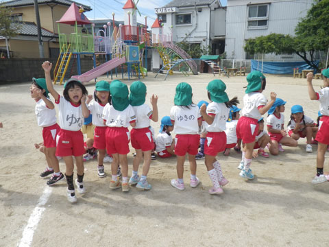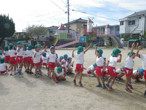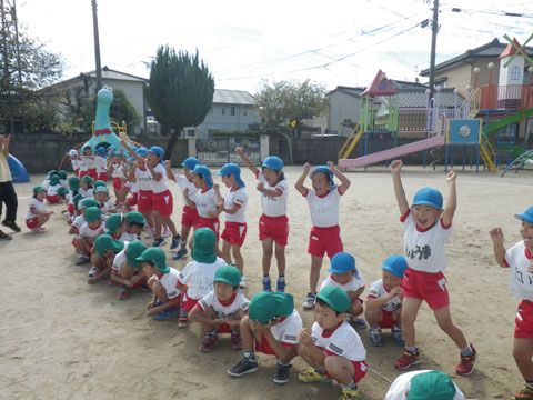 年長組さんはマーチング、年中組さんは組体操にマルモリ