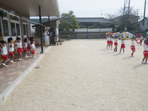 製作を終えた年少児さん、園庭のマーチングを見学中・・・