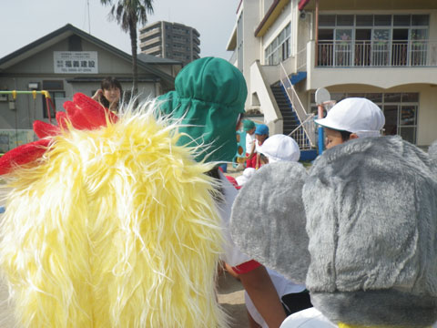 にわとり、ぞうと遊んでいると、園児のおじいさまが来園