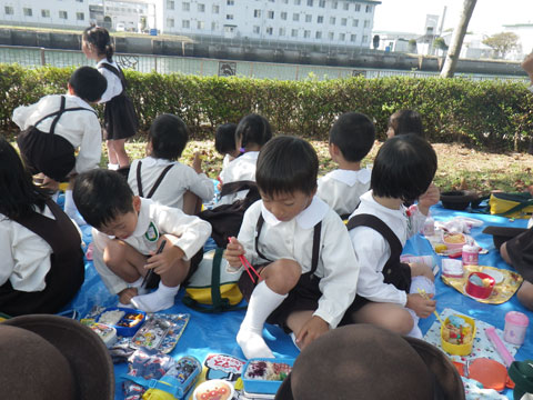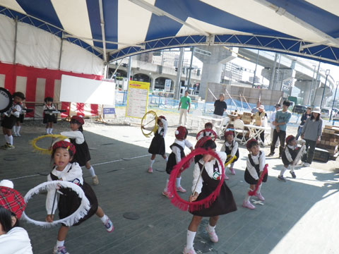 一方、年長組さんは制服のままスカーフを巻いたりハチマキを付けたり、