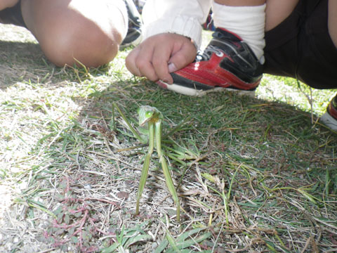 食後は、園児もバッタもコオロギもカマキリもみんなで遊びました