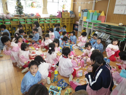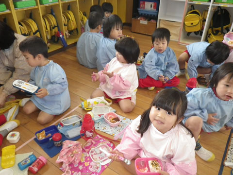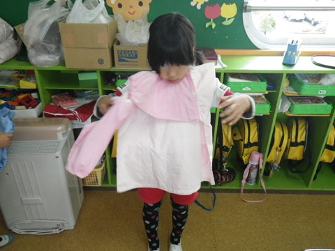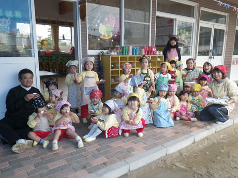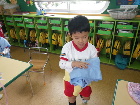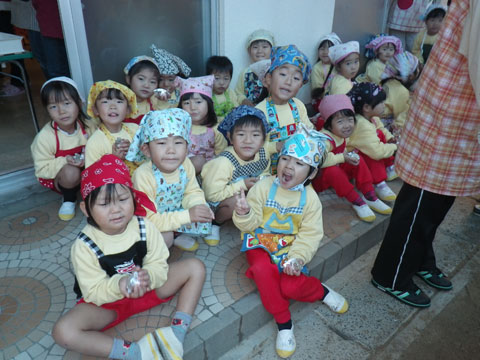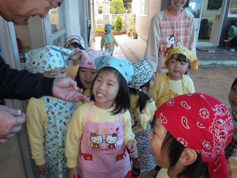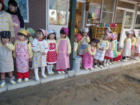 エプロン・三角筋を身に着けた園児も待ちきれない様子