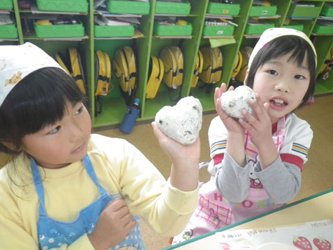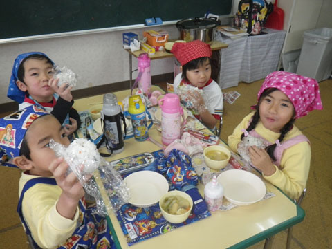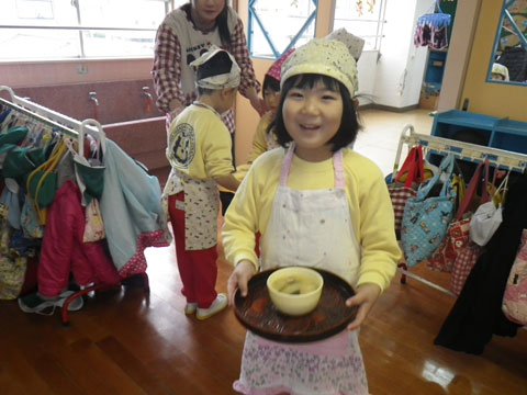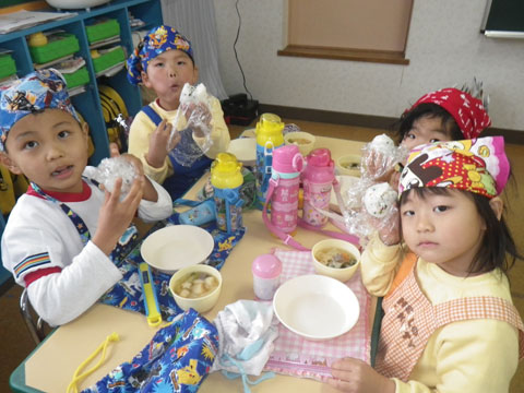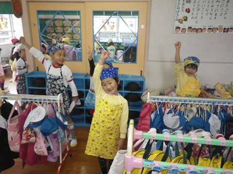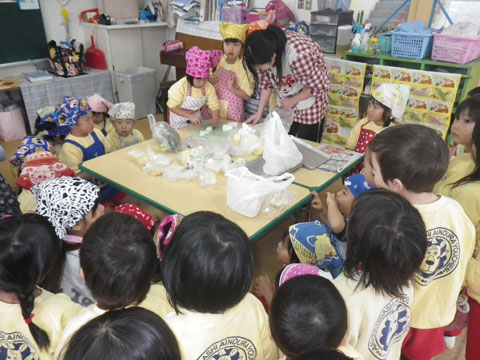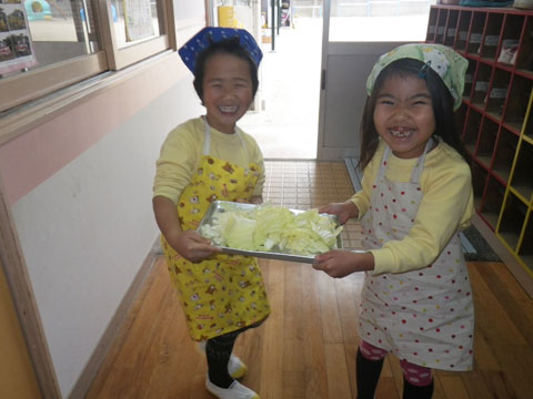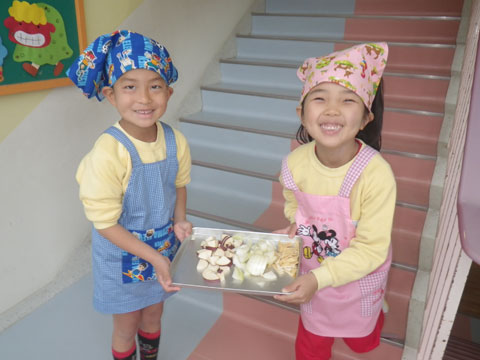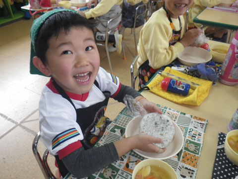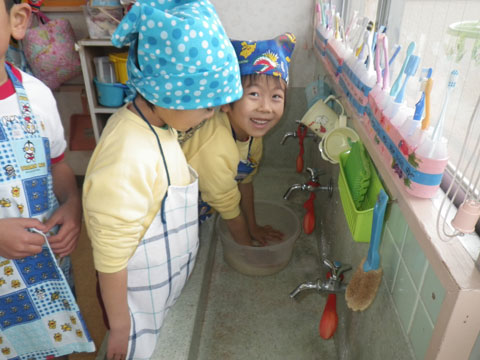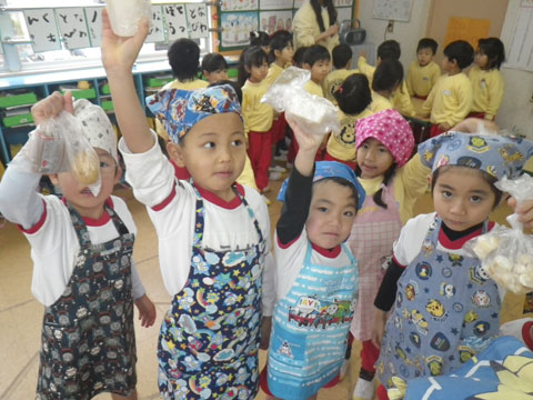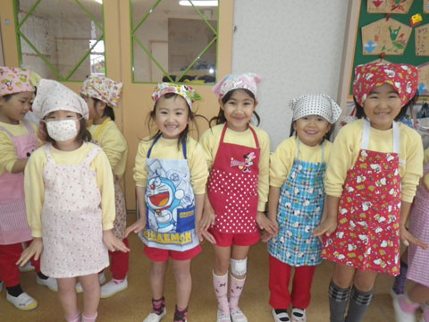 では!年長組さん、エプロン・三角巾を身にまとい、