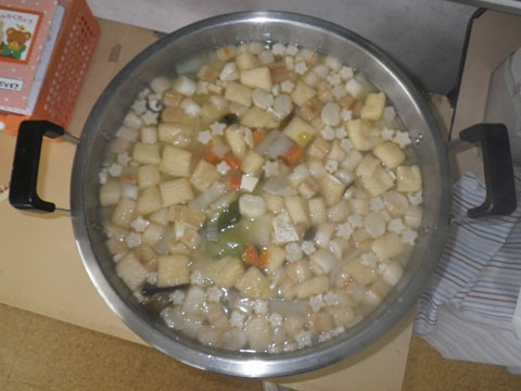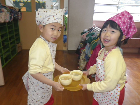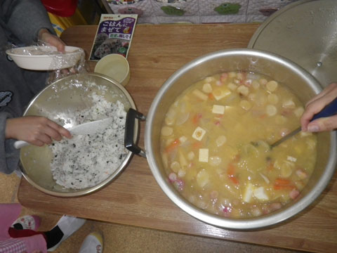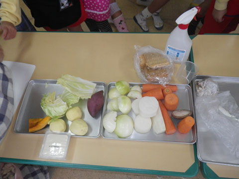 エプロン・三角巾・おみそしるの具(チャレンジ精神歓迎)の準備を