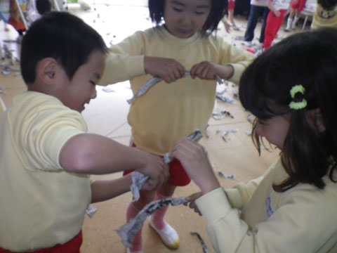新聞紙を使って遊んだりも
