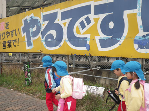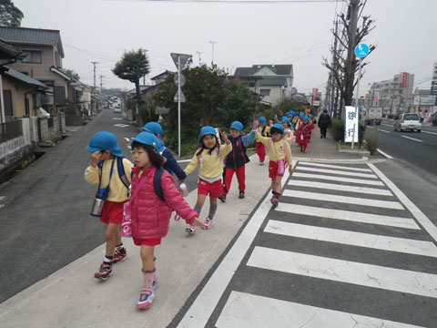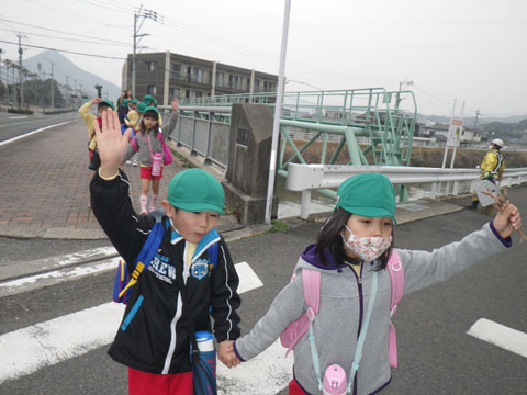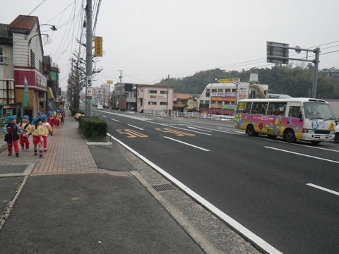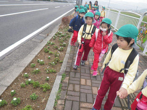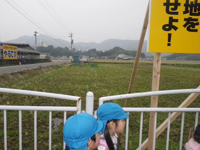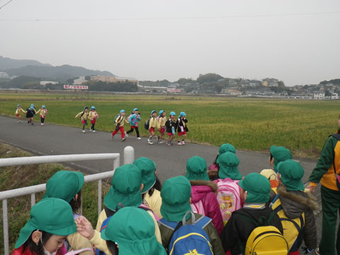 遠くの農道には東相浦幼稚園の年長組さんが歩いてます