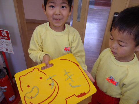 今週は晴天から  来週の月曜日は卒園式ですので、 最後の一週間です  登園すると、  水道の横にきれいなブロックが  卒園製作が完成  昨日・・、  お世話になりました。 ありがとうございます! 園庭が明るくなりました  ドッジボールも絶好調   春の雰囲気が漂ってきました  年中組の男の子!  「ほら、す!す!!」 数分後、  進化  “す”が付く言葉なんてたくさんあるのに、 あえてこの言葉  誰を思い浮かべながら作ったのでしょう  給食食べて、あそんで、  最後の一週間、年長組のみんなとの 思い出を作らないと