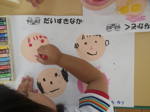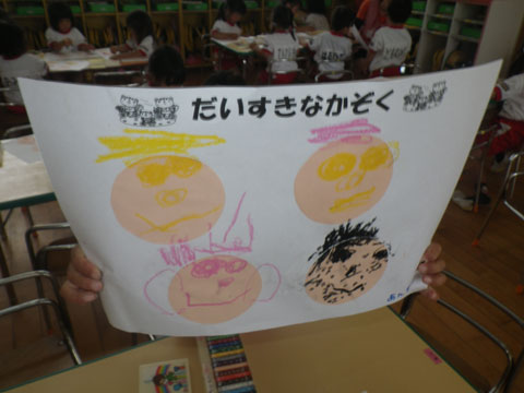 教室へ戻ってから、年少組さんは家族の絵を描いてます