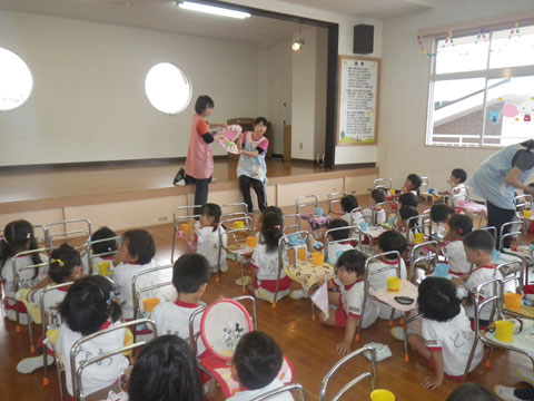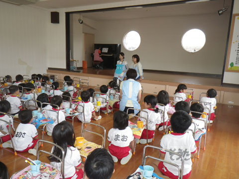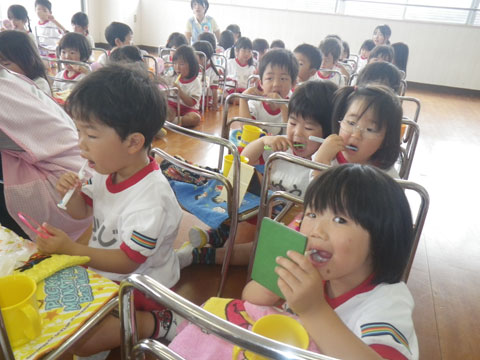 まずは先生たちからの話や、大きな口を使っての歯みがきの方法を指導