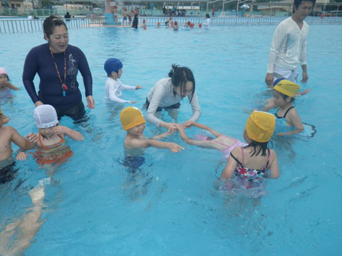 「シュッシュッポッポ♪」と電車を作ってプール内を周遊し、