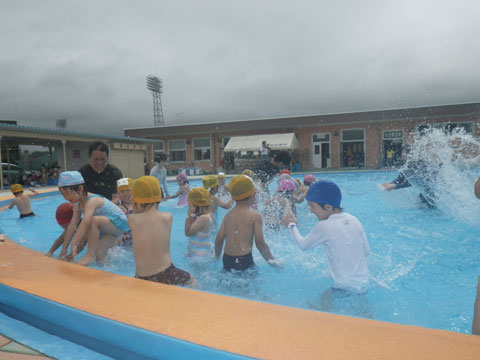 今朝のどしゃ降りで一度はプールを中止とした年少組さん