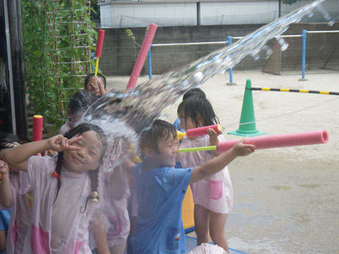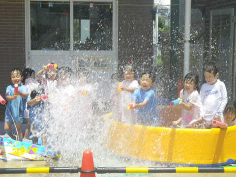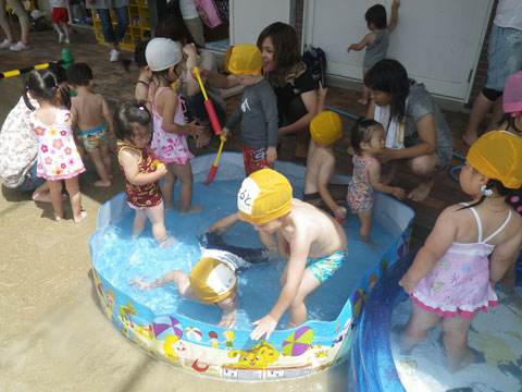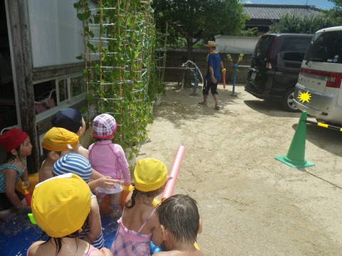 午後は、あまりの暑さに年中組のみんなが水遊び