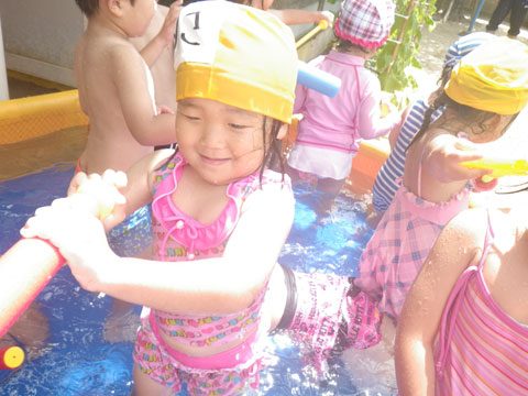 バッチリ水着着用で、さらに水鉄砲で名人を狙撃中