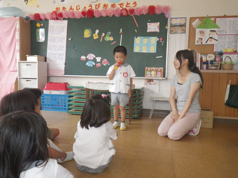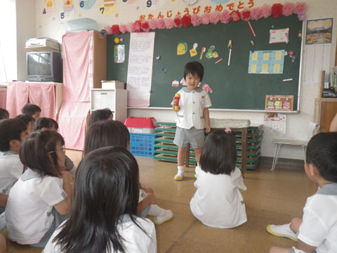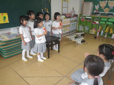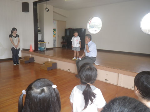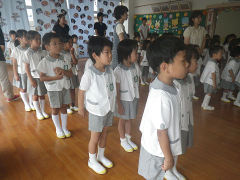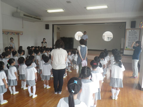 そんなこんなで、おゆうぎ室へ全園児集合し、終業式