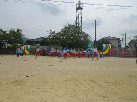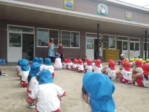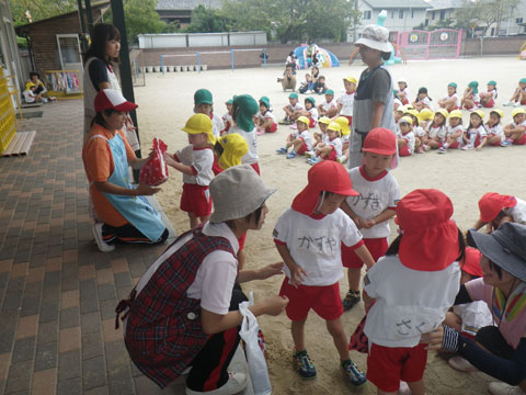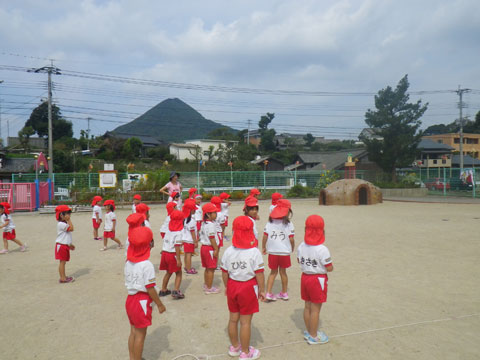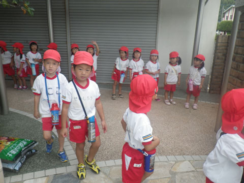 年中組さんは組体操の合同練習のため東相浦幼稚園へ出発