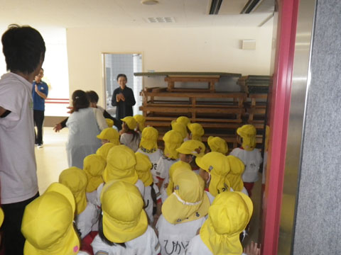 「いってきまーす!」大人も合わせて30人弱、一斉に乗れるエレベーターから降りて、