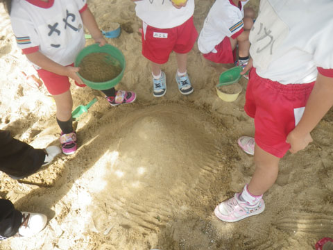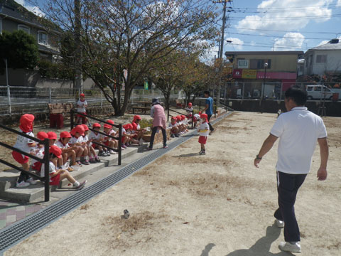 音楽が止まったところで、「♪げんこつ山のたぬきさん」を一緒に