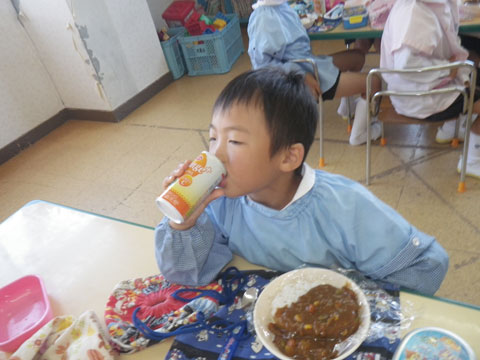 カレーといただいたジュースで乾杯