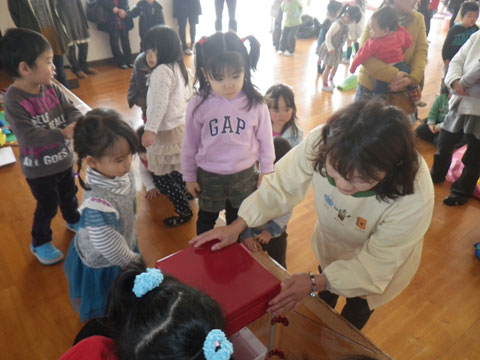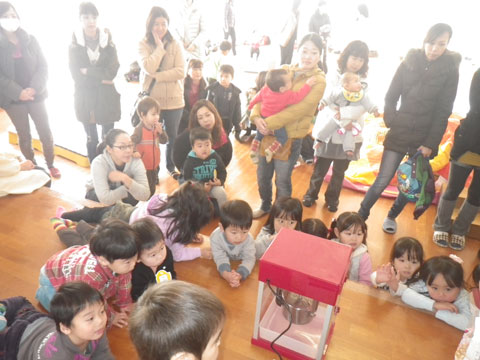 おゆうぎ室の未就園児さんの前に『ポップコーンマシーン』登場