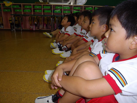 ステージに立つ園児の皆さん、イメージトレーニングを