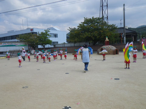 食後、今日も年長児がマーチング&リレー!