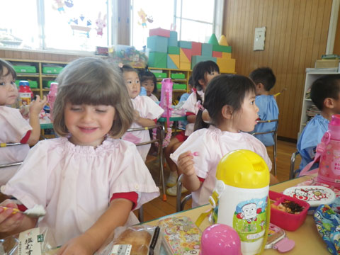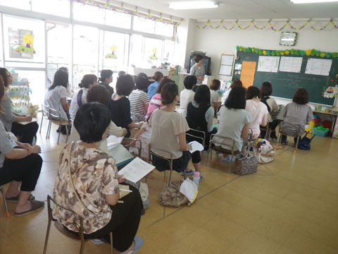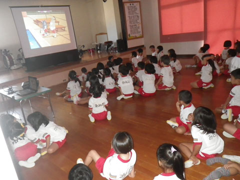 おゆうぎ室が映画館に早変わりして、みんなでワイワイ待ってます