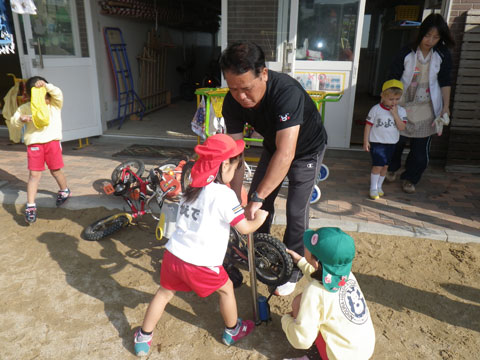 自転車の空気入れ名人とともに力仕事を手伝い中