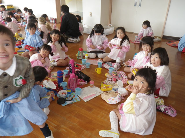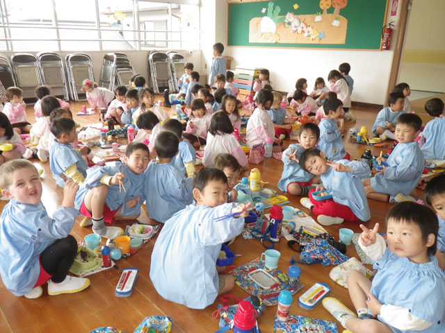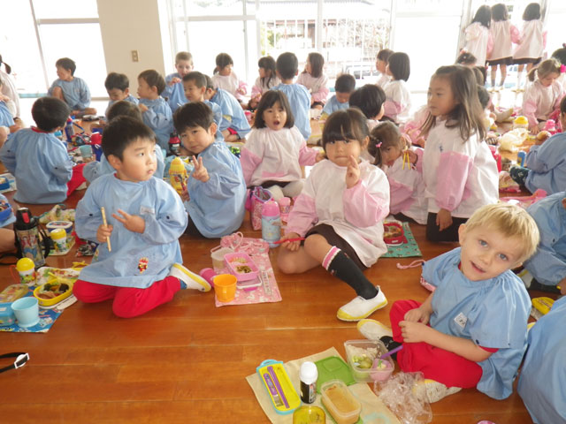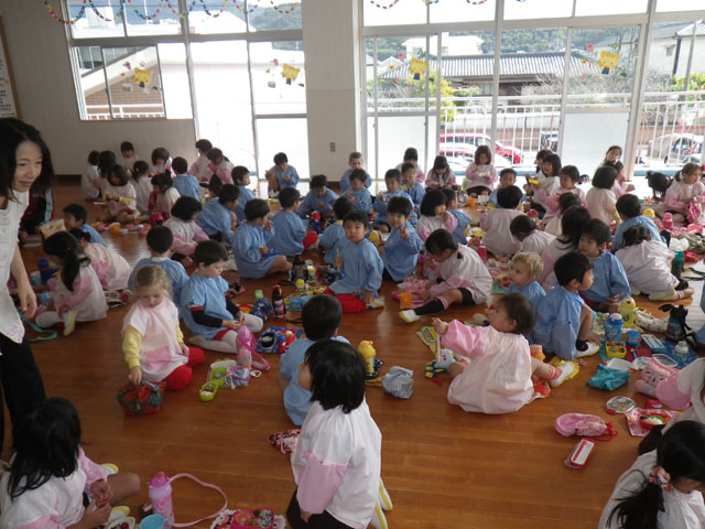 今日は全園児、おゆうぎ室にてお弁当タイム