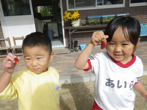 園内のミニ畑でイチゴが収穫できました!