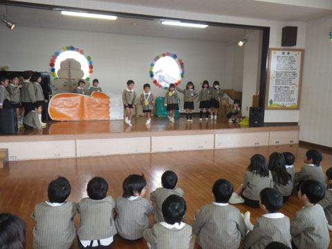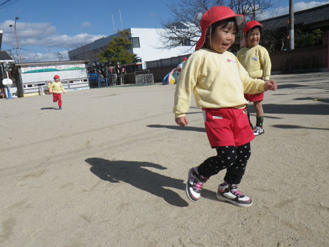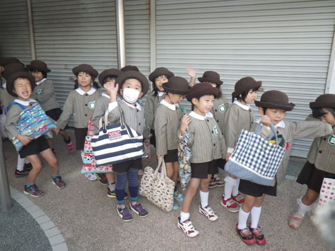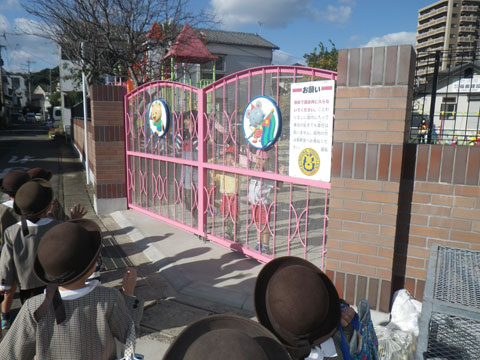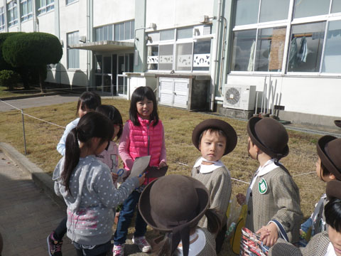 園庭であそんでいる年中児・年少児にも見送られ、徒歩で学校へ。