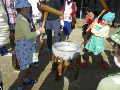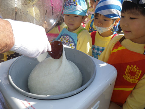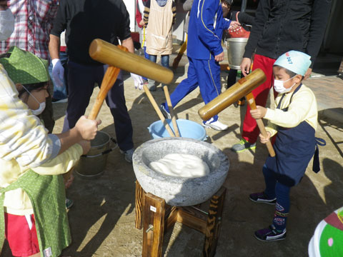 もちつき準備完了で、エプロン・三角巾も装着完了