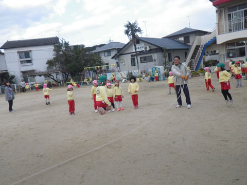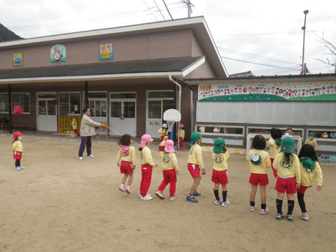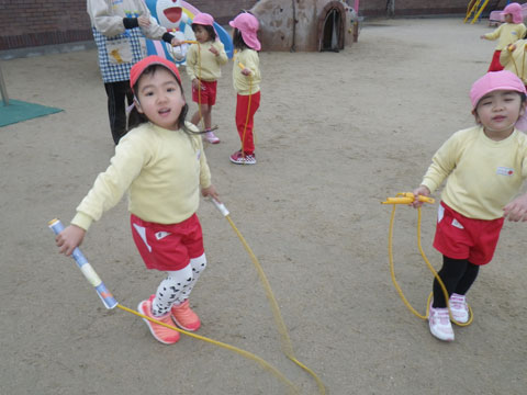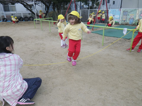 その先輩の姿を見る年少児、さすがに長縄からはじめるのも・・