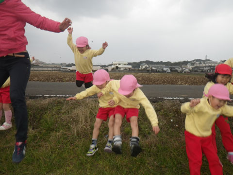 冬の田んぼでじゃんぷをしてみたり、草花を摘んだり、