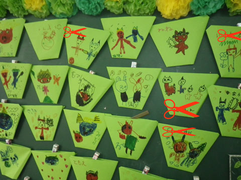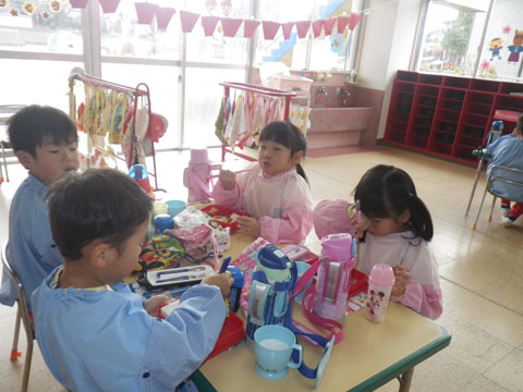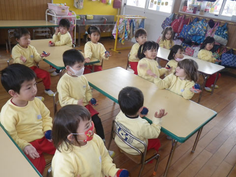 もうすぐおとずれる節分に向けて、年長児の手作り豆袋が完成