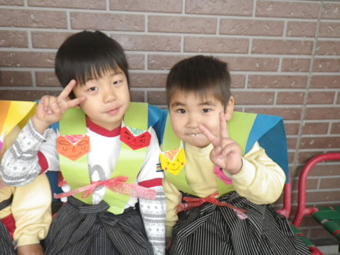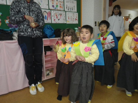 『豆まき』のスタートは、2月生まれの園児が裃を着て各教室へ。
