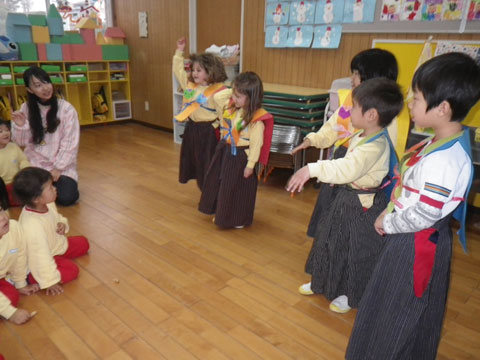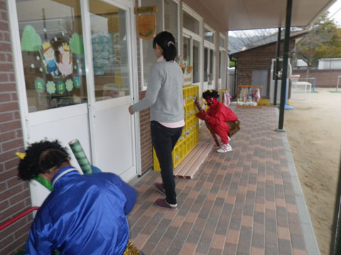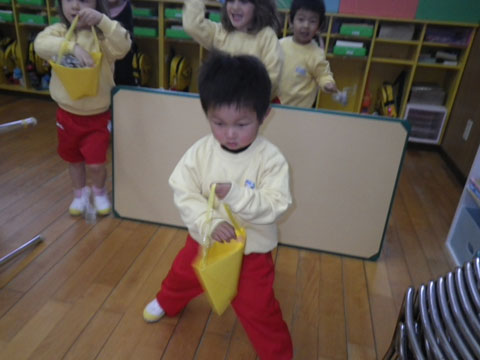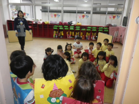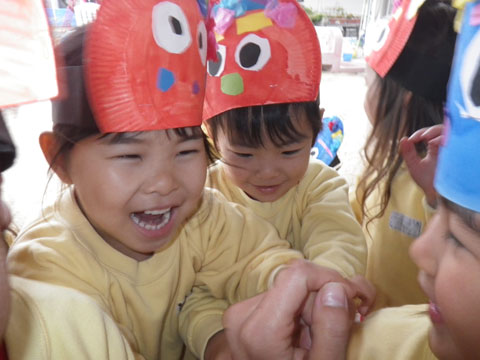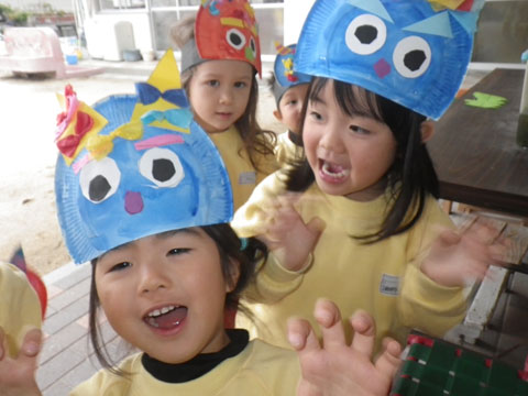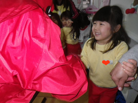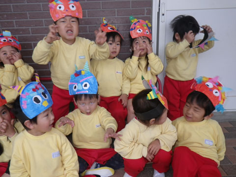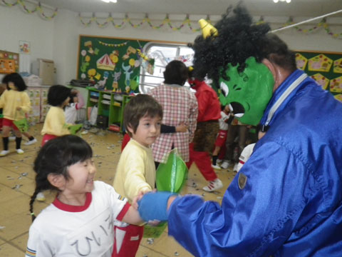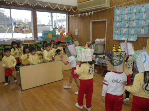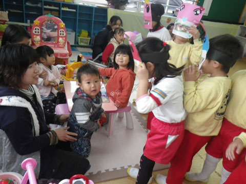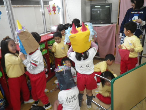 先日製作した鬼のお面を付けて、年長児が年中児・年少児の教室へ。