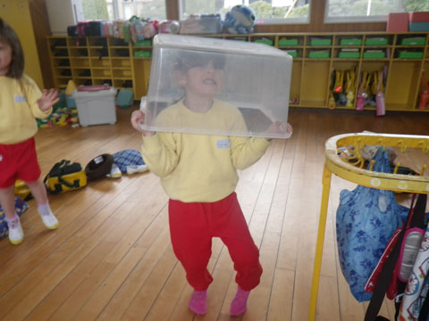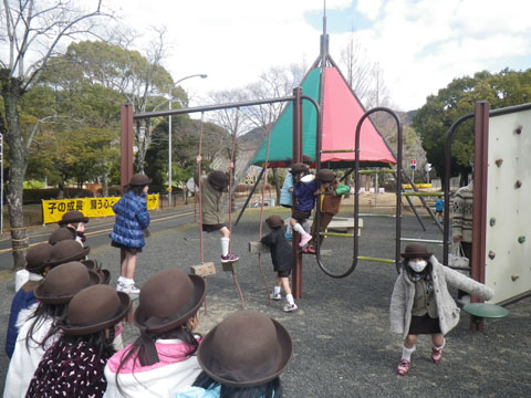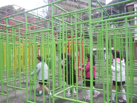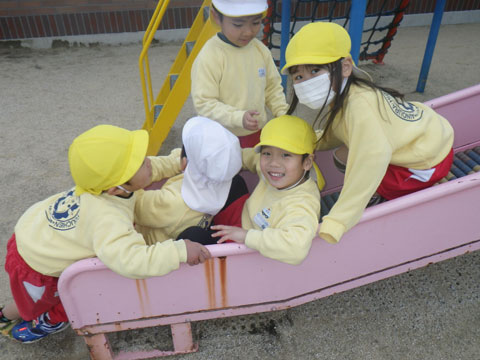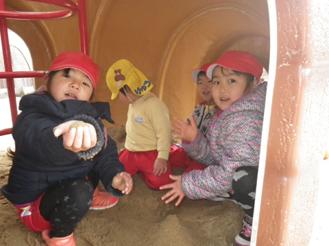 友だちと身を寄せ合ってあそんだり、築山の中に入ったり、