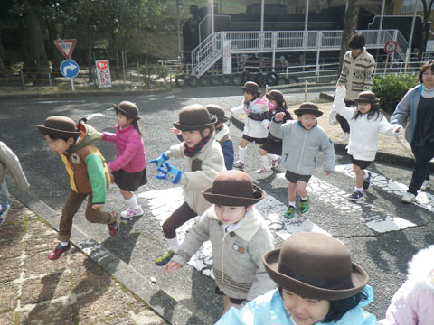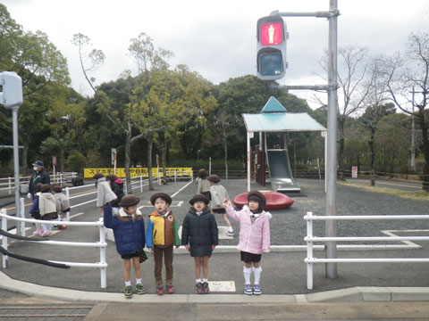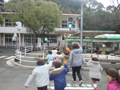 北風が吹く中、外へ出て横断歩道を渡る練習開始