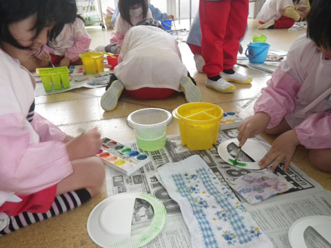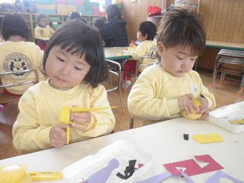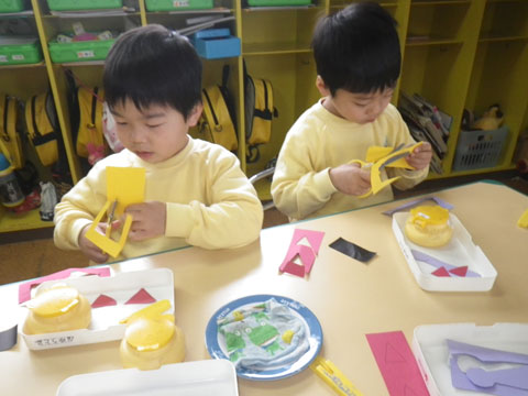 年少児の製作、こちらも同じように当初はぎこちなかったハサミ使いが