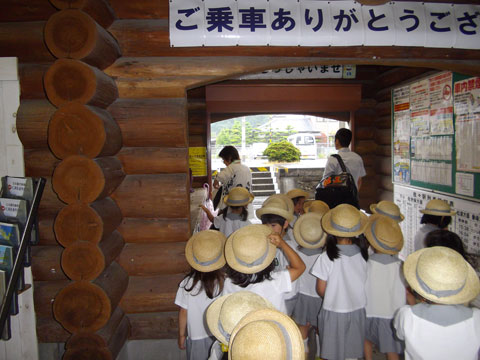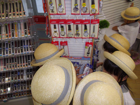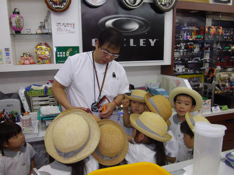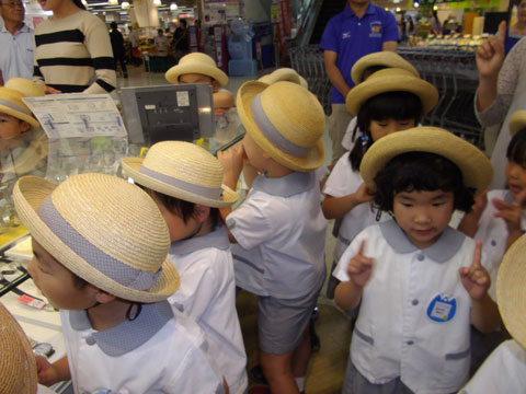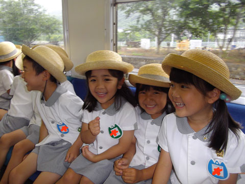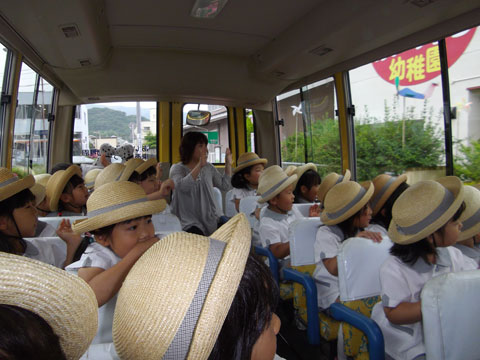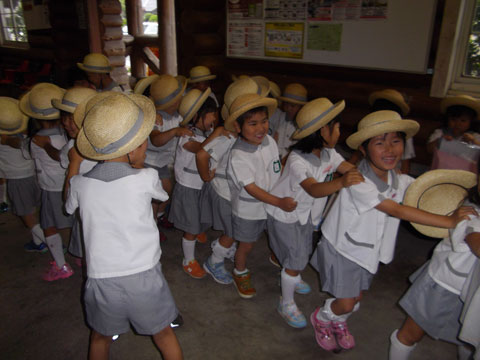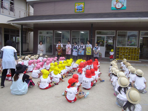 見た目にも涼しげな夏服・麦わら帽子姿で年長児が出発