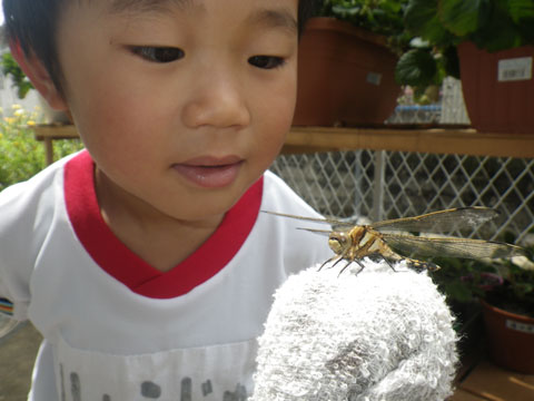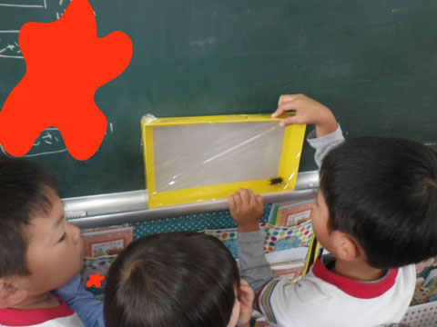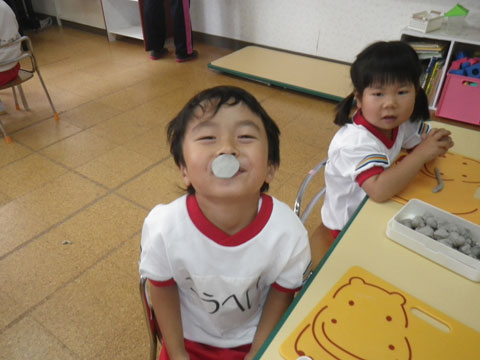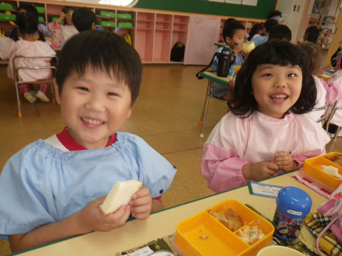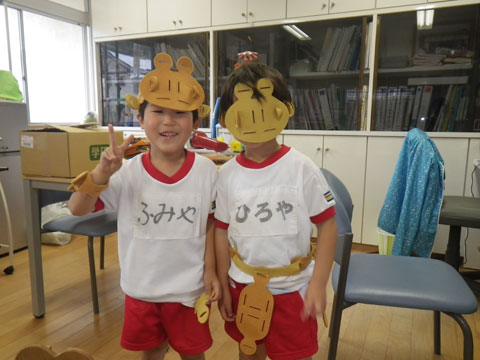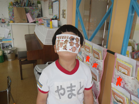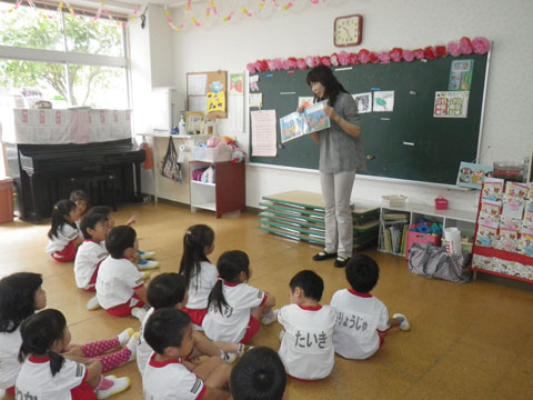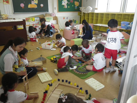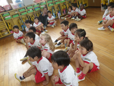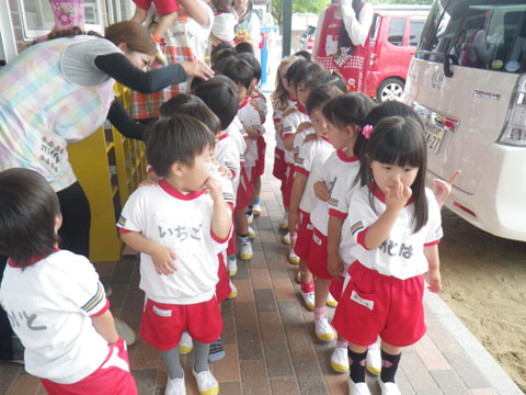 英語教室を終えた年少児が整列して、どこかへ・・・。