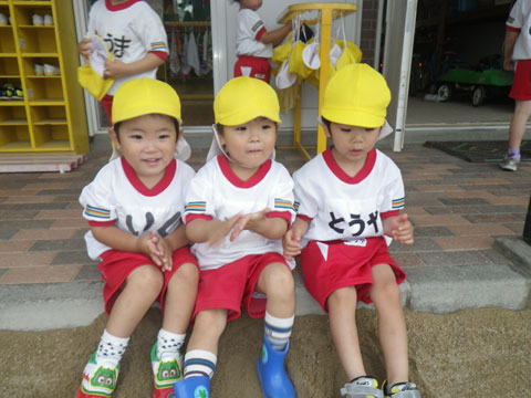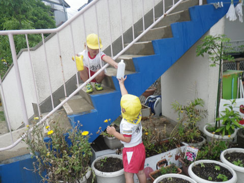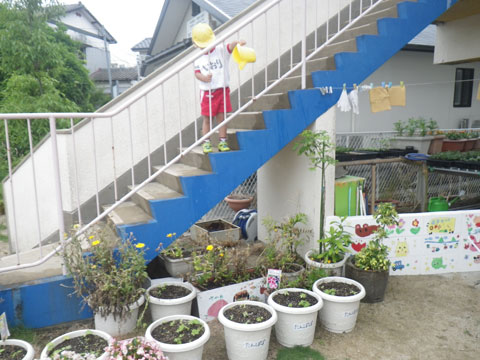 水道と階段に分かれせっせと連携プレーを見せる年少児。