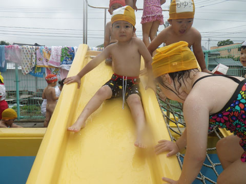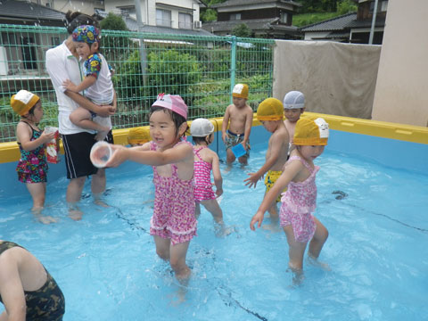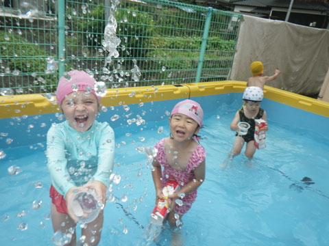曇り空に負けず、めいっぱい水あそびを楽しむ年少児
