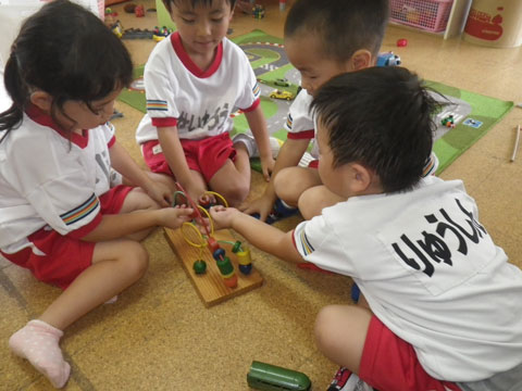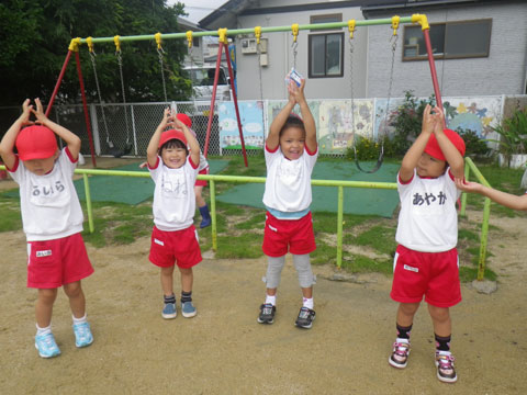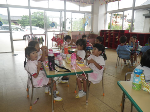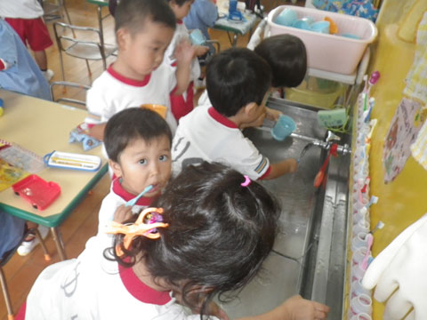 入園当初からしたらびっくりする、年少児の食後の歯みがきに、