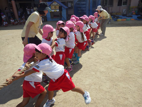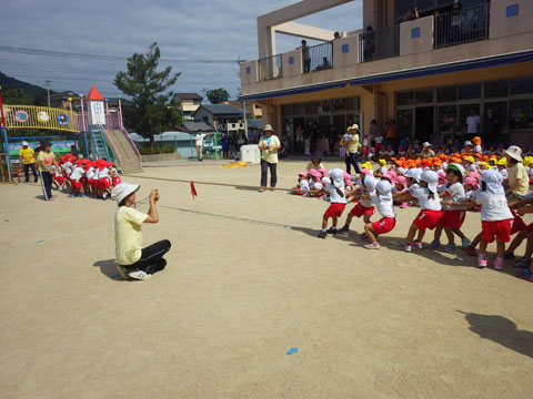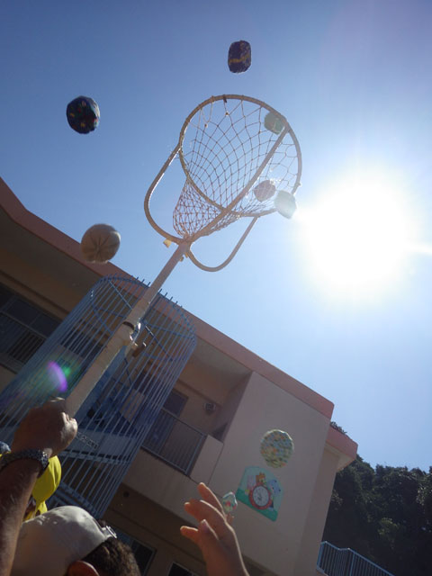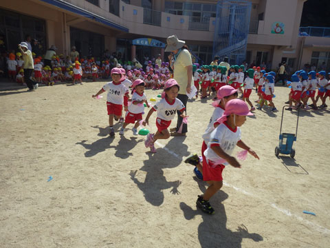 年長児VS年中児・年少児の玉入れでは・・、若干のブーイングが